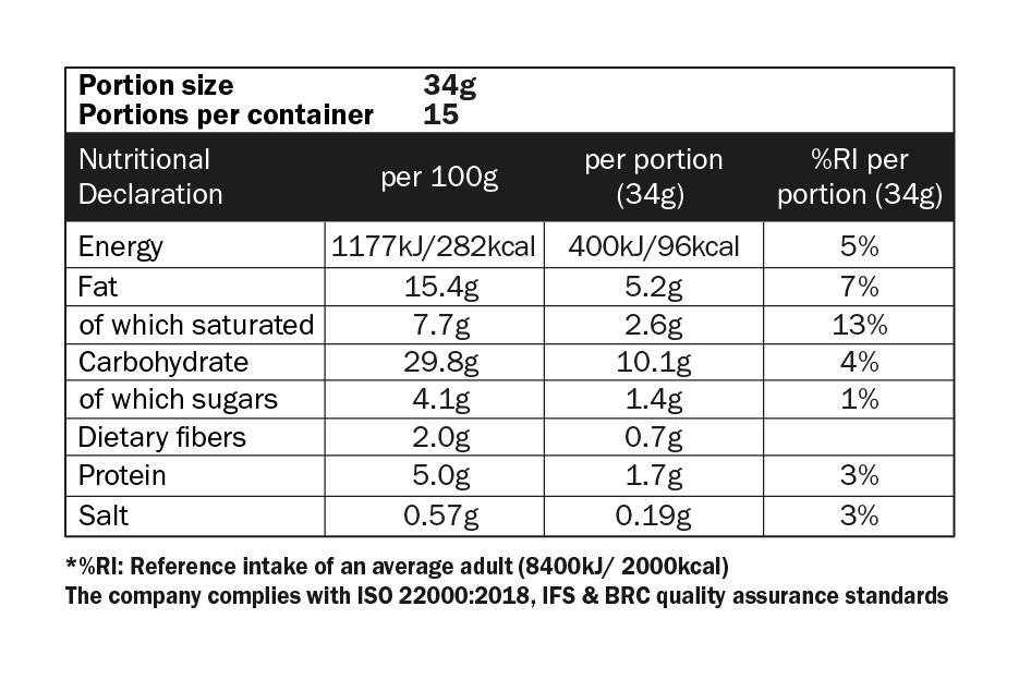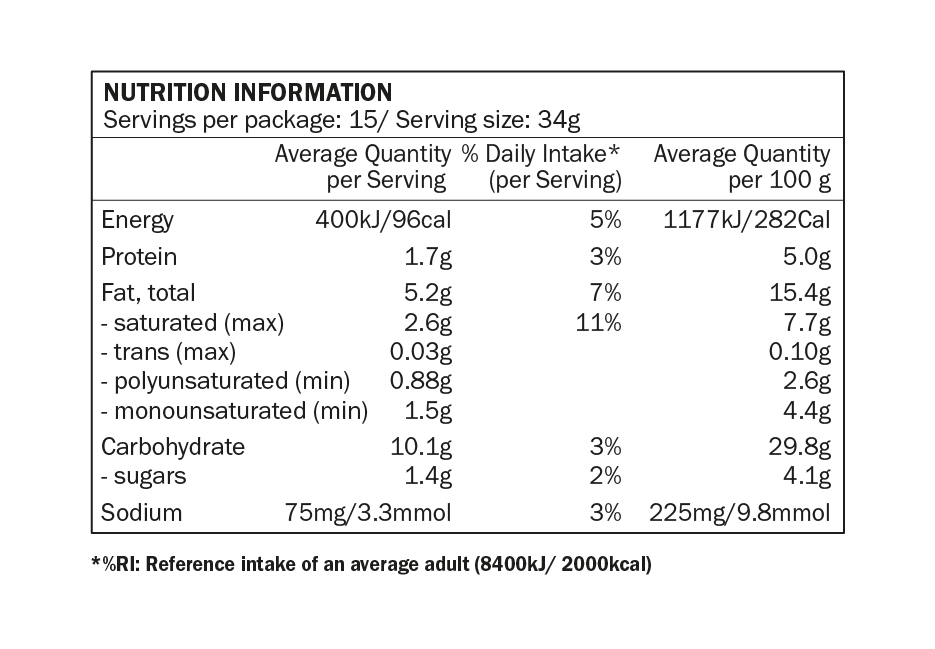 MAY CONTAIN: SESAME, TREE NUTS, PEANUTS, MUSTARD, SOY (LECITHIN).