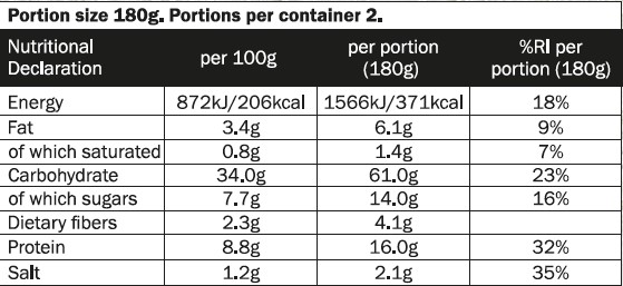 Tomato 35,5%, plant based minced meat Beyond meat 21% from E.U. [water, pea protein 16%, rapeseed oil, coconut oil, rice protein, flavouring, cocoa butter, dried yeast, stabilizer (methylcellulose), potato starch, apple extract, salt, potassium salt, maize vinegar, concentrated lemon juice, emulsifier (sunflower lecithin), colour (beetroot red), maltodextrin, pomegranate extract], onion, red pepper 10%, green pepper 10%, wheat bulgur, tomato paste, extra virgin olive oil 1%, salt, parsley 0,7%, dill 0,5%, red pepper, black pepper, cumin, garlic powder.