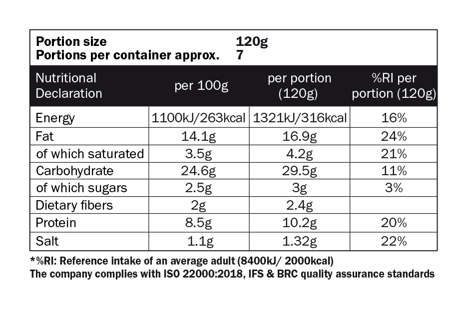 Feta cheese P.D.O. 33%, water, whey cheese (mizithra) 26%, wheat semolina, modified starch, egg white powder, corn semolina, salt, black pepper.