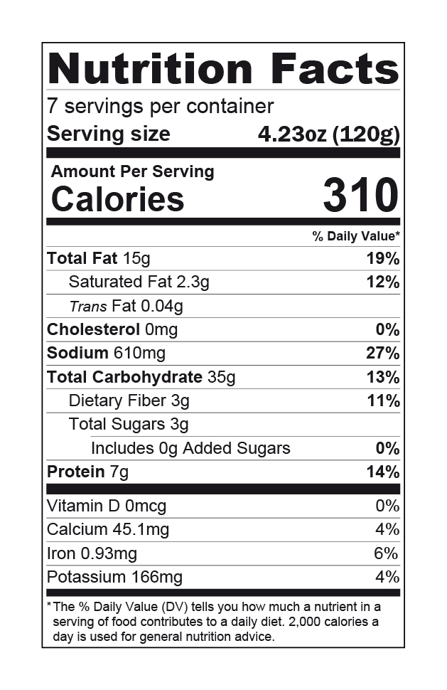 Spinach 54%, onion, modified starch, extra virgin olive oil 5%, salt, dill, garlic powder.